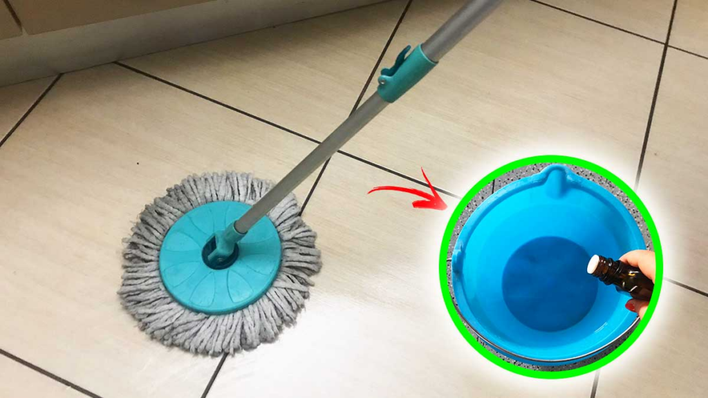 En este punto, añade unas gotas de aceite esencial de árbol de té. Vierta la fregona y el trapo en el recipiente y déjelos en remojo en la solución durante aproximadamente media hora.
